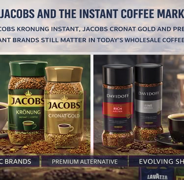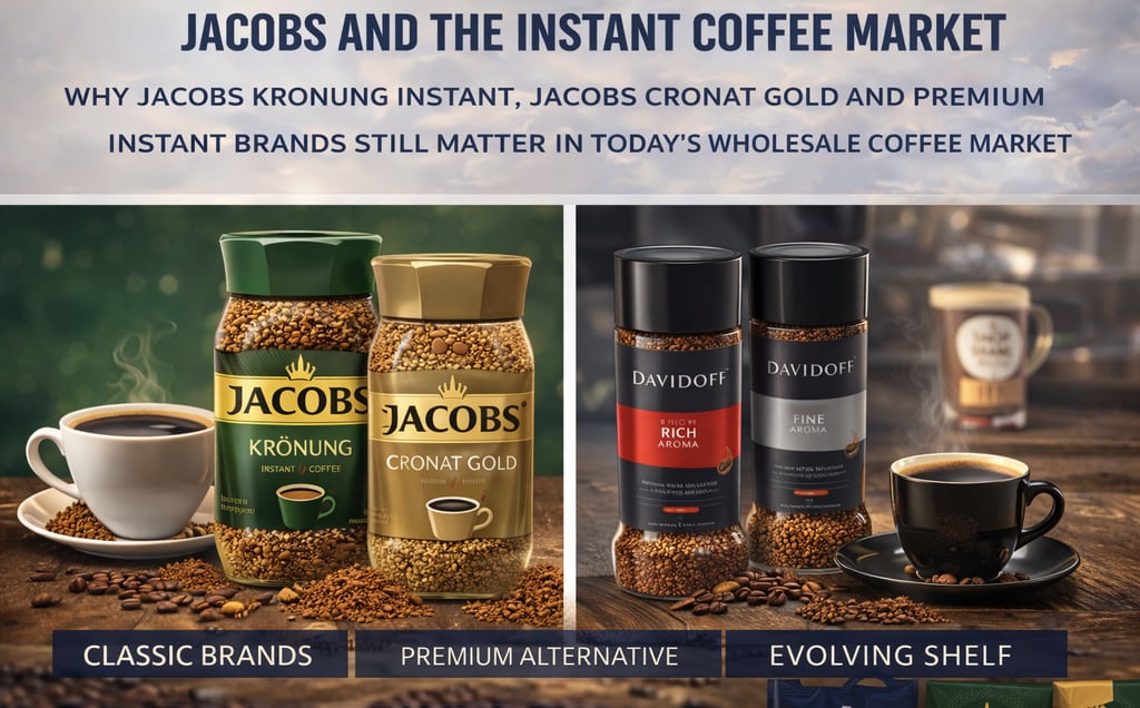 That is why Jacobs Krönung Instant and Jacobs Cronat Gold remain useful reference points in wholesale. They stand for the reliable, recognizable side of the instant market, while Davidoff represents premium instant positioning with stronger aroma language, more lifestyle appeal and more product segmentation. Together, they show what the instant coffee shelf looks like now: not just cheap convenience, but a layered category with room for classic daily drinkers, premium Arabica buyers, flavored options and origin-inspired formats.